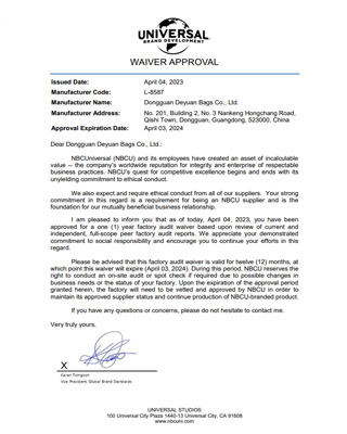 UNIVERSAL Universal Film and Television Authorization Letter